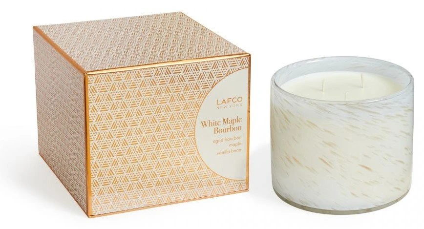 LAFCO White Maple Bourbon 3 Wick Candle (aged bourbon|maple|vanilla bean): Smooth barrel-aged bourbon is combined with notes of white maple wood and precious vanilla bean, reminding you of quiet evenings by the fire. Pistachio, palo santo, and hints of caramel are added to create an intoxicating and enveloping scent.